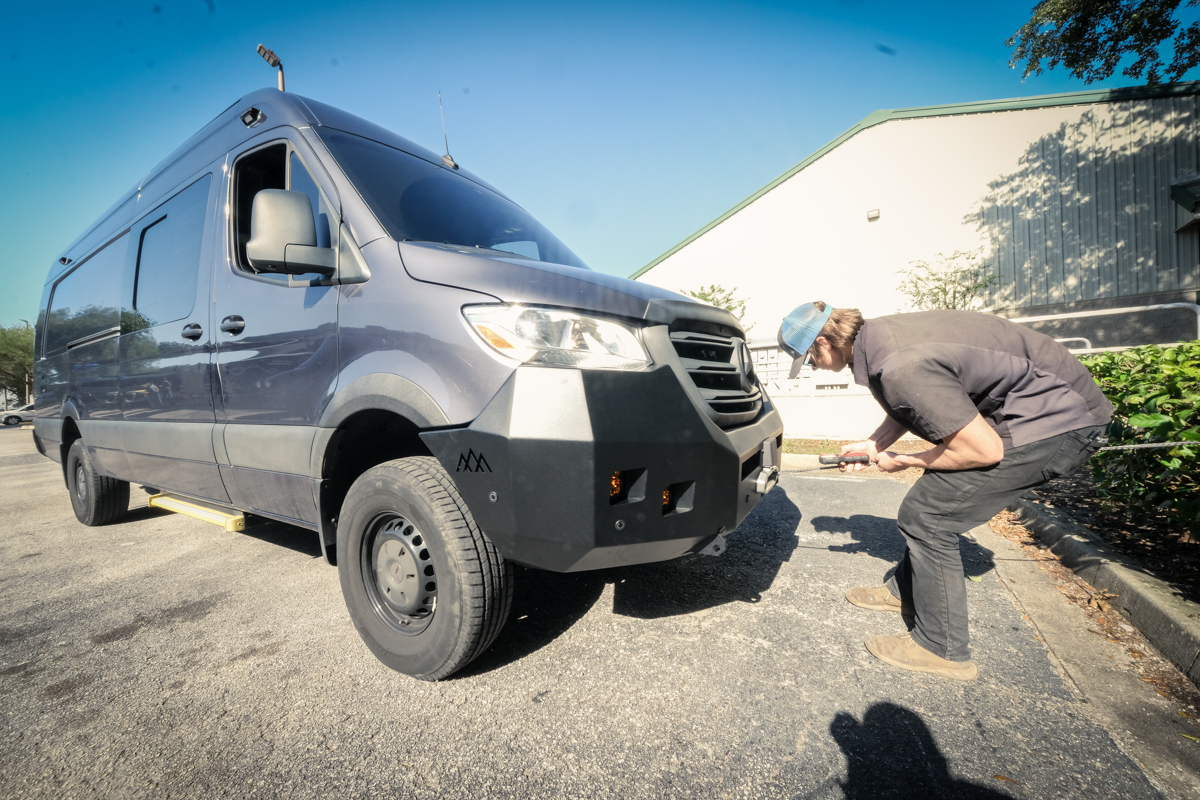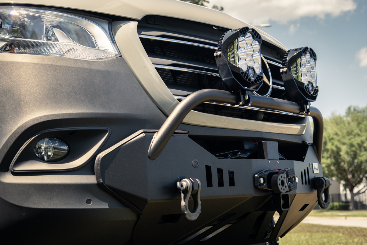 The original Backwoods Bumper for Mercedes Sprinters. This bumper provides a more aggressive look for your van. The bumper is equipped with mounting zone for Warn winch, 2 shackle hooks, 4 square light pockets, and full DEF tank protection.